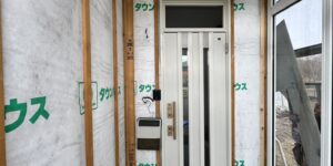 既存の外壁解体が終わりました。雨水か入り込んだ場合に備え、サ …