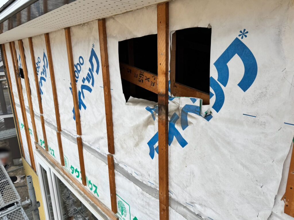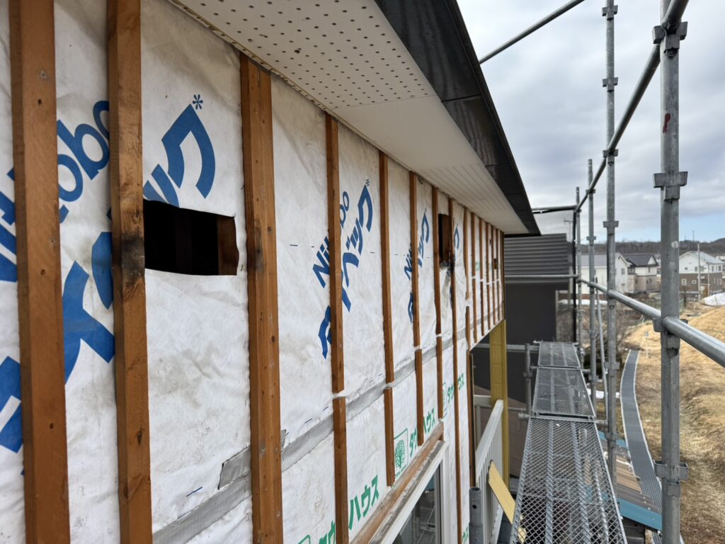 既存外壁の出隅は差込み出隅だった為、下地材の幅を広くする必要があり、細かな手直しをしながら外壁が張れる状態を確保します!