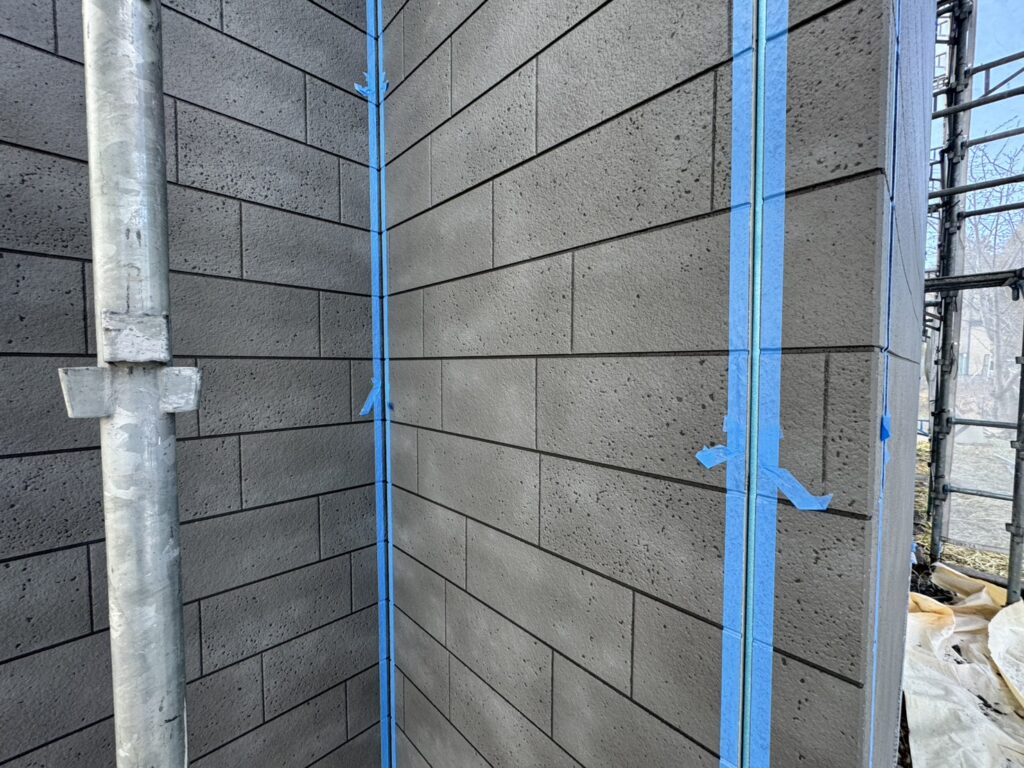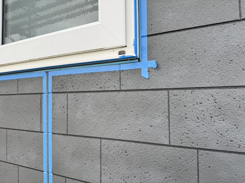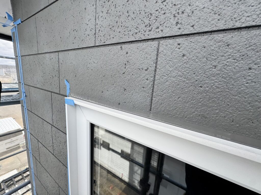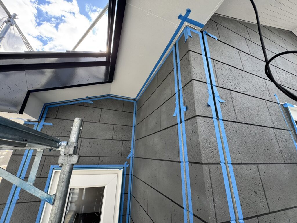 全面張り終えたので最後のコーキング作業を行なっておりますが、建物の形が複雑でなかなか進まず苦戦しております。